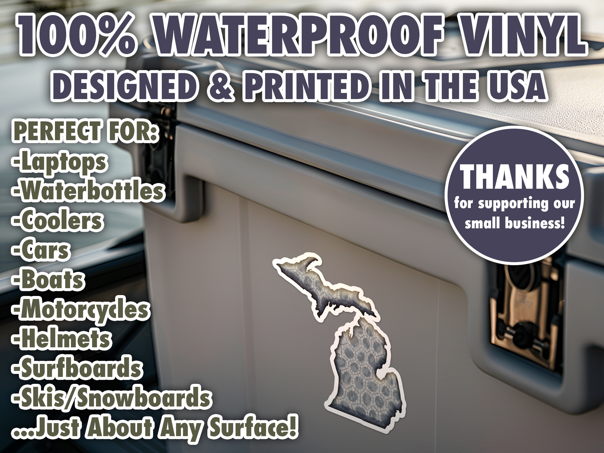 Michigan Petoskey Stone Sticker is 100% Waterproof Vinyl that works great with Water Bottles, Laptops, Cars, or just about anywhere!